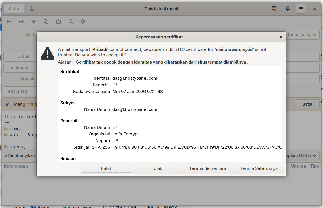 closedThe wildcard TLS certificate was not recognized by the mail server, resulting in a TLS error warning